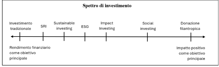 Questo capitolo cercherà di fare un po’ di chiarezza terminologica nell’ambito della finanza sostenibile e di mettere in luce le differenti forme che essa può assumere. A tale fine verrà utilizzato quello che da molti autori viene definito spettro del capitale (o spettro di investimento). Al lato sinistro del continuum si posizionano gli investimenti tradizionali, dove il focus è sul rendimento economico; al lato destro, di contro, si pongono le donazioni filantropiche (investimenti a fondo perduto) che hanno come scopo la massimizzazione del ritorno sociale o ambientale